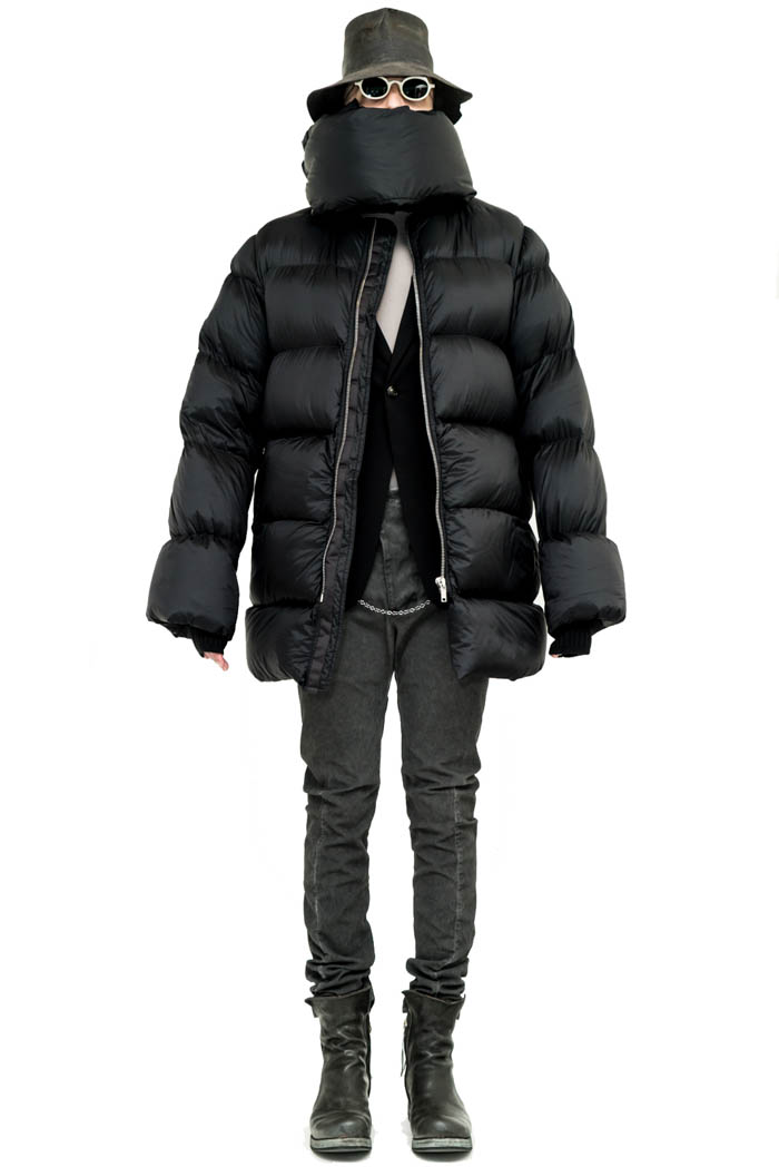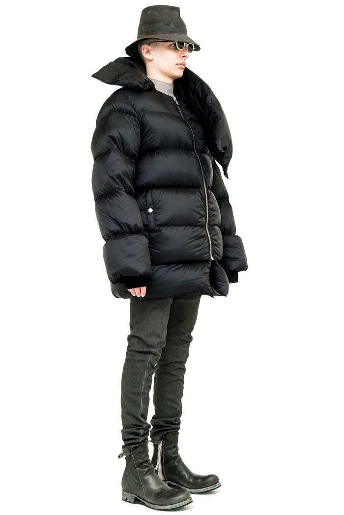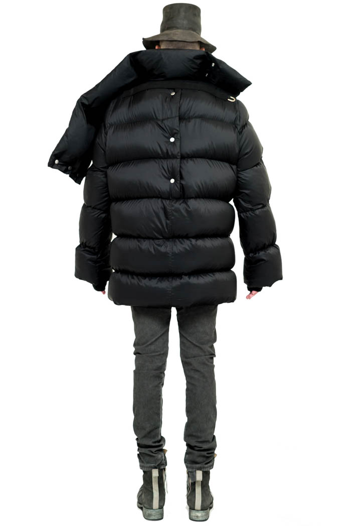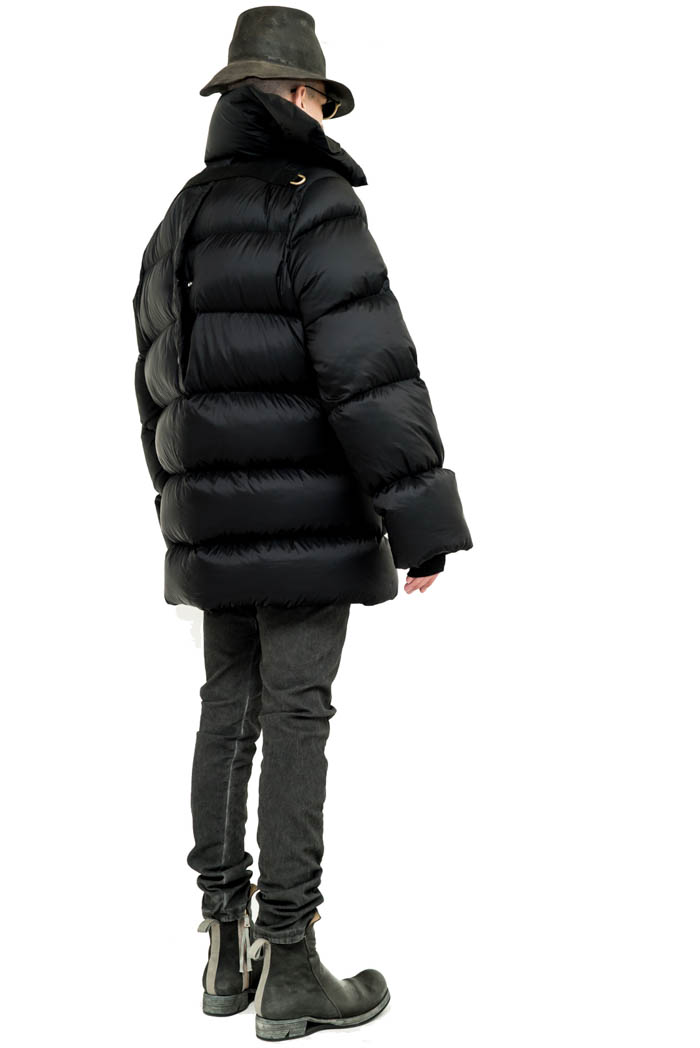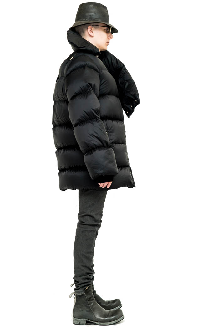 RICK OWENS FW17 GLITTER OFF-THE-RUNWAY FUNNEL NECKED COAT IN BLACK NYLON MICRO FIBER